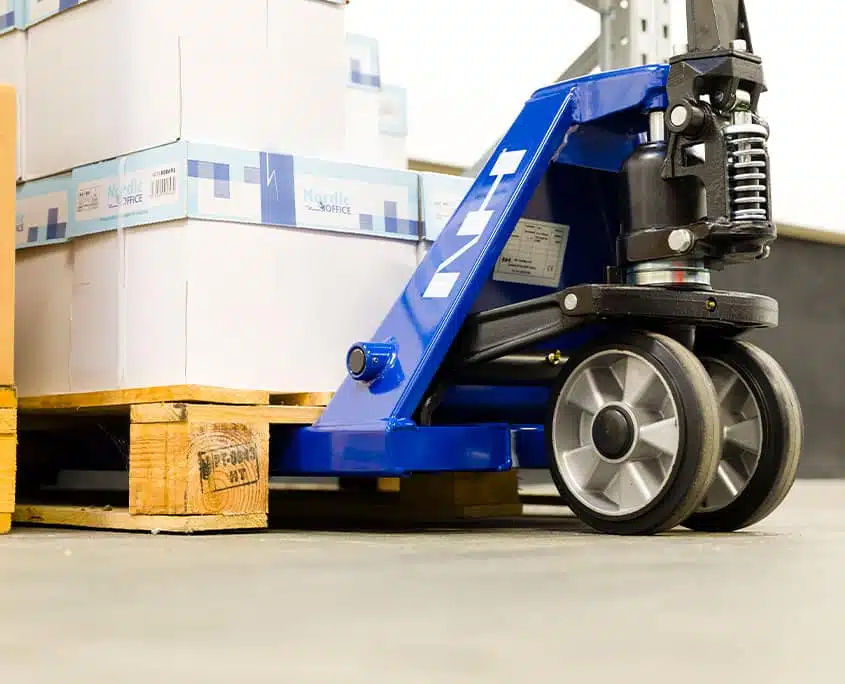 Monteret med rulle foran og bagved gaffelhjul for lettere til- og frakørsel på pallens brede side